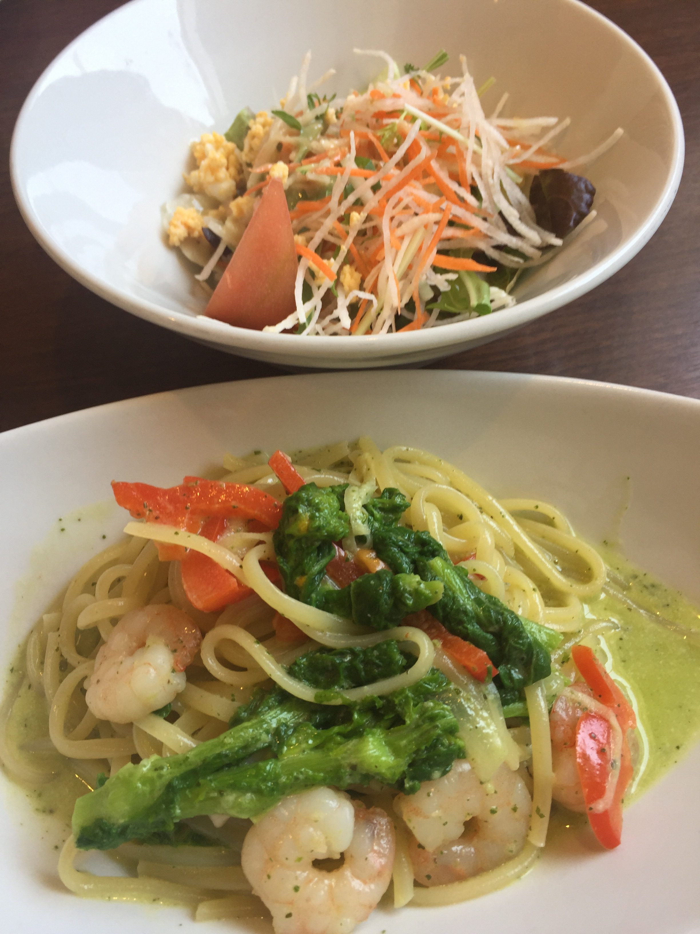 今日のランチは、パスタを食べたくなりナポリの食卓にきてます。写真はエビの菜の花のバジルクリームパスタです。
